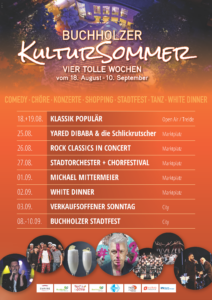 Gemeinsam mit Partnern aus der Kultur, Buchholz Marketing, der Stadt Buchholz, den Stadtwerken und der Volksbank Lüneburger Heide freuen wir uns, den „Buchholzer Kultursommer“ präsentieren zu dürfen!